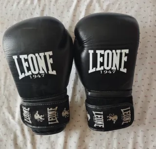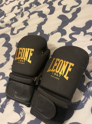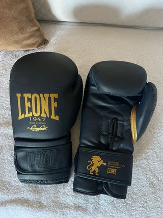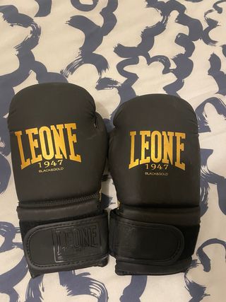 Par de guantes de boxeo Leone, ideales para Muay Thai. Muy poco uso, nada de malos olores. - Color negro con detalles dorados. - Peso de 14 onzas. - Cierre de velcro para ajuste seguro. - Diseño con logo Leone y año 1947. Cualquier duda preguntar sin compromiso.