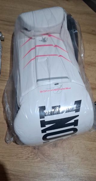 Guantes de boxeo unisex de la marca Leone, modelo de alta gama. -Relleno de alta protección para mayor absorción de golpes. -Fabricadoncon piel de búfalo de alta calidad. - Color rojo y blanco. - Cierre de velcro. - Logo LEONE 1947. Solo tienen un par de semanas de uso, están totalmente nuevos y en perfecto estado.