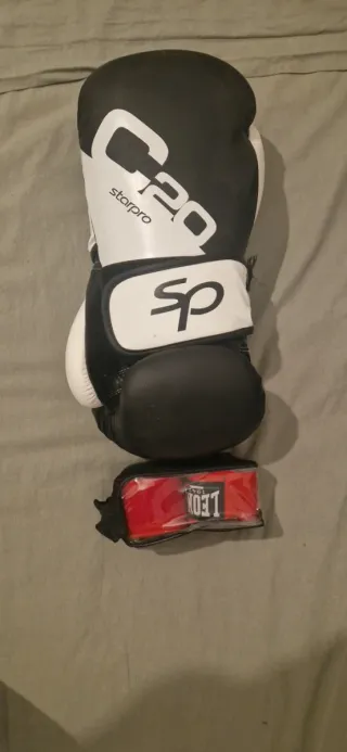 Set de guantes de boxeo C20 Starpro en color blanco y negro, junto con vendas rojas. Nuevo, no se ha usado. - Guantes de boxeo C20 Starpro. - Vendas rojas leone.