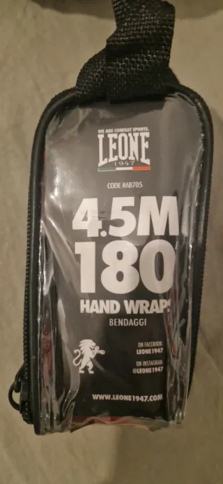 Pack de boxeo con guantes Leone y vendas Venum. - Guantes de boxeo negros con logo Leone en blanco. - Vendas de boxeo rojas con logo Venum en blanco.