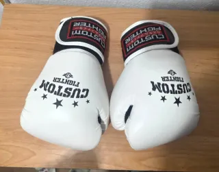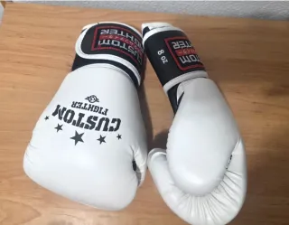 Par de guantes de boxeo de la marca Custom Fighter. - Color blanco. - Tamaño 8 oz. - Diseño con estrellas y logo. Usados menos de 1 mes