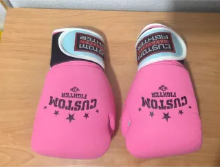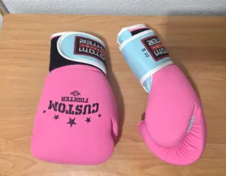 Par de guantes de boxeo de la marca Custom Fighter en color rosa. - Diseño con estrellas y logo. - Cierre de velcro. - Talla 8 oz. Usados menos de 1 mes.