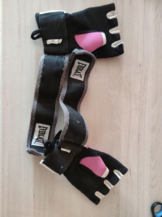 Set de guantes de boxeo y vendas. Estan como nuevas, son de 10 onzas - Guantes de color rosa con diseño. - Vendas de color rojo.