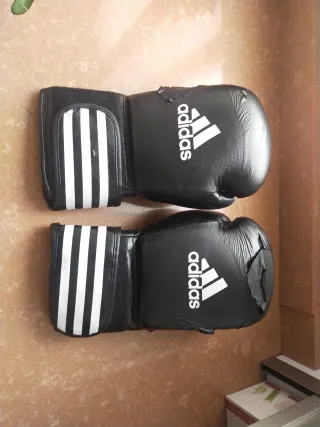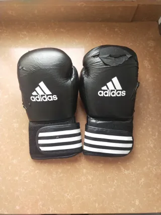 Par de guantes de boxeo de la marca Adidas en color negro. Presentan el icónico logo de la marca. - Cierre de velcro. - Diseño con tres franjas blancas. Muy machacados. Sirven para acabar de reventarlos