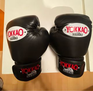 Par de guantes de boxeo o Muay Thai de la marca Yokkao en color negro. - Diseño con logo Yokkao en blanco y rojo. -12 onzas. - Cierre de velcro. - Inscripción en Tailandés y comprado en Tailandia.