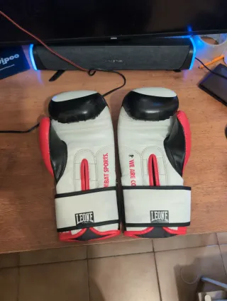 Guantes de boxeo de la marca Leone, de 16 onzas. Presentan un diseño clásico en blanco y negro con detalles rojos. - Marca: Leone 1947 - Peso: 16 oz - Color: Blanco, negro y rojo En muy buen estado solo utilizado un par de veces.
