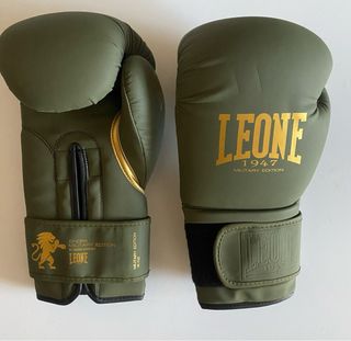 Guantes de boxeo Leone 1947, edición militar. - Color verde oliva. - Tamaño 16oz. - Diseño con león dorado y detalles en dorado y negro.
