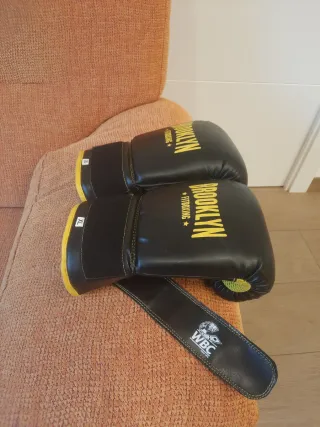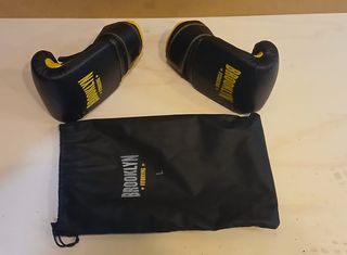 Par de guantes de boxeo marca Brooklyn Fitboxing. - Color negro con detalles en amarillo. - Incluye bolsa de transporte negra con logo. - Talla L.
