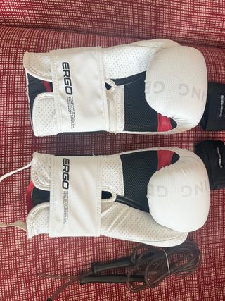 Par de guantes de boxeo marca Ergo de 12 oz. - Color blanco con detalles en negro y rojo. - Cierre de velcro. - Material perforado para ventilación. incluye vendas largas y cuerda de entrenamiento. excelente estado se retira por el barrio de gracia
