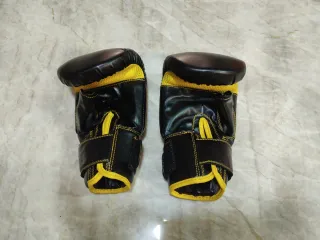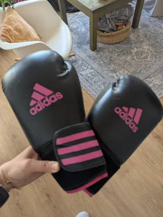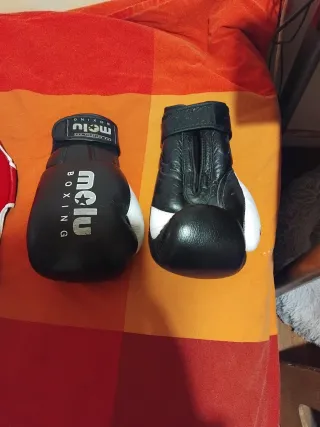 Set de entrenamiento de boxeo con guantes y protecciones. tienen uso, pelados en la parte frontal por los golpes, algo normal para unos guantes de 3 años de uso, pero totalmente funcionales. precio original aprox 45 solo los guantes asi que esta bastante bien de precio,