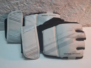 Guantes de entrenamiento Decathlon Outshock, diseñados para entreno de boxeo, kickboxing, MMA... Son de color blanco con detalles en gris y negro. - Cierre de velcro. - Material sintético. - Diseño sin dedos.