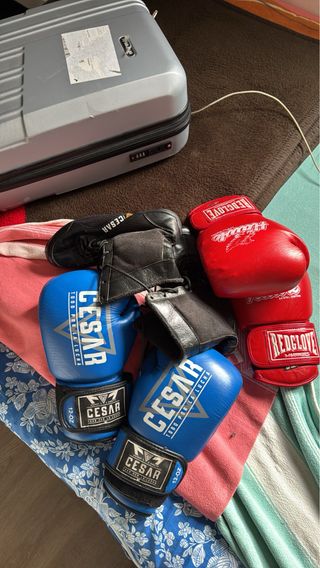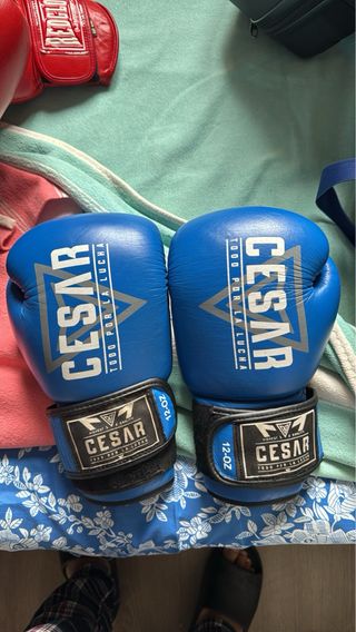 Lote de guantes de boxeo de las marcas CESAR y REDGLOVE. Incluye un par de guantes azules CESAR de 12 oz, un par de guantes rojos REDGLOVE y un par de vendas negras. zapatillas talla 42 - Guantes azules CESAR con diseño Todo por la lucha. - Guantes rojos REDGLOVE con logo Hawke. - Guantes negros con cierre de velc
