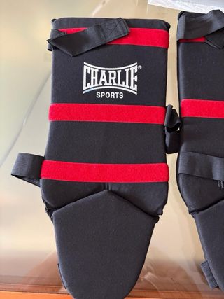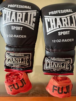 Set de guantes de boxeo Charlie y vendas de mano Fuji. - Guantes de boxeo Charlie Profesional Sport 12 OZ-RAIDER. - Vendas de mano Fuji de color rojo.