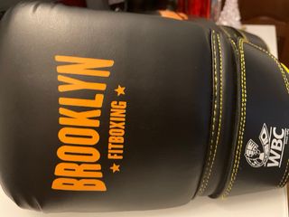 Guantes de boxeo negros con detalles en naranja y amarillo. - Marca: Brooklyn Fitboxing - Logo WBC - Talla L retirar en Sagrada Familia
