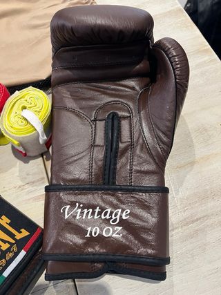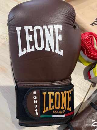 Guantes de boxeo Leone en color marrón, modelo vintage. - Guantes nuovos, nunca puestos, Logo LEONE en blanco en el dorso. - Cierre de velcro en la muñeca. - Detalle de la bandera italiana en la parte inferior.