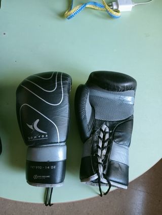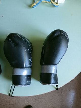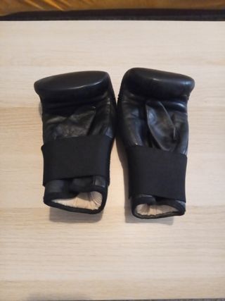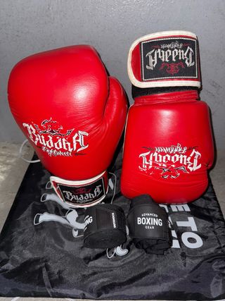 Guantes de boxeo marca Buddha. Totalmente nuevos (no llegué a usarlos por una lesión). Añado juego de vendas negras de la misma marca, y vanda tubular elástica, sin usar.
