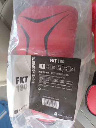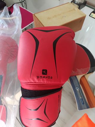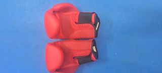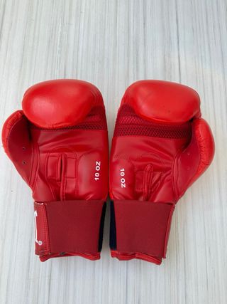 Par de guantes de boxeo de Decathlon en color rojo. - Talla 10 Oz. - Cierre de velcro. - Material exterior sintético. - Interior de malla transpirable. SIN USAR
