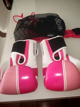 Set de guantes de boxeo FIT en colores rosa y blanco. Incluyen una bolsa de malla negra para guardarlos. - Diseño bicolor en rosa y blanco. - Cierre de velcro. - Inscripción #URPINKINCREDIBLE en la muñeca. - Bolsa de malla con cordón de ajuste.