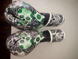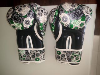 Guantes de boxeo con un llamativo diseño de calaveras y flores en tonos verdes y grises. Talla 10 Oz. Unisex - Diseño de calaveras y flores. - Colores verde, gris y blanco. - Cierre de velcro.