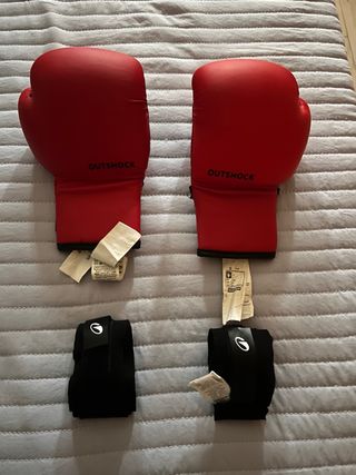 Set de guantes de boxeo rojos para niños(9&10 años)vendas negras. - Guantes de la marca Outshock. - Vendas de color negro.