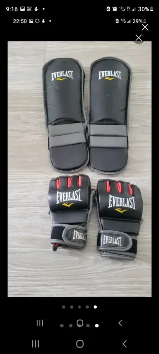 Set de protecciones de boxeo Everlast, incluye un par de espinilleras y un par de guantes. - Espinilleras de color negro con detalles grises. - Guantes de MMA o boxeo sin dedos, negros con detalles rojos y blancos. - Logo de Everlast visible en ambas protecciones.