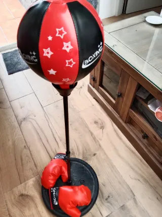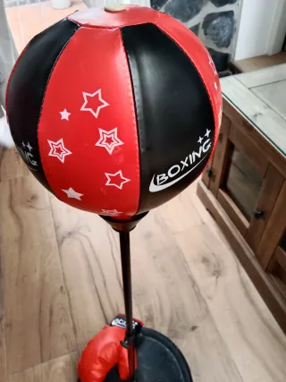 Divertido juego de boxeo para niños, ideal para iniciarse en este deporte. Incluye un saco de boxeo y un par de guantes. - Saco de boxeo con diseño de estrellas rojas y negras. - Base estable para mayor seguridad. - Guantes de boxeo rojos.