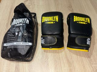 Set de guantes de boxeo Brooklyn Fitboxing. - Color negro con detalles en amarillo. - Cierre de velcro ajustable. - Incluye bolsa de malla para guardarlos. - Talla S.