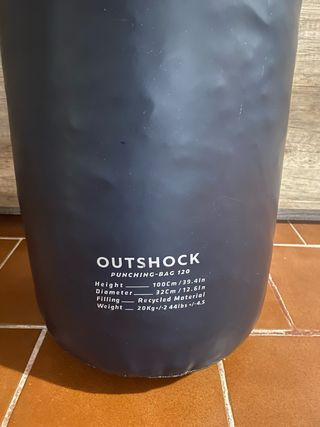 Saco de boxeo de la marca Outshock, color negro, con cadena para colgar. - Material: Polipiel. - Relleno: Materiales reciclados. - Peso: 18kg aprox. - Incluye guantes de 14oz con vendaje. Se regalan guantes de fitboxing y vendajes