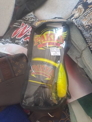 Pack completo para boxeo que incluye guantes, vendas y zapatillas. - Guantes de boxeo negros 14oz. -zapatos boxeo talla 43. -vendas ceesar 3 metros. -vendas negras 4.5 metros. - Vendas de boxeo naranjas y negras. - Zapatillas de boxeo grises con cordones rojos.