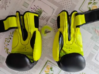 Par de guantes de boxeo de la marca Pakka en llamativo color neón. - Color: Amarillo neón y negro. - Cierre de velcro. - Diseño ergonómico. - Talla 10 onz -Incluye su bolsa y un protector vocal. El único detalle q tiene como manchas negras, pero está nuevo, muy poco uso