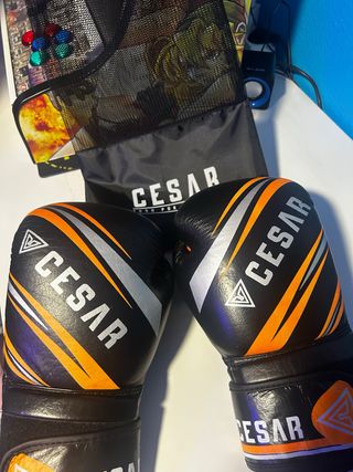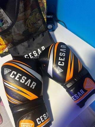 Guantes de boxeo de la marca Cesar, nuevos y sin usar. Incluyen su funda original para guardarlos. - Diseño moderno en negro con detalles naranjas y plateados. - Logotipo de Cesar visible en los guantes y en la funda.