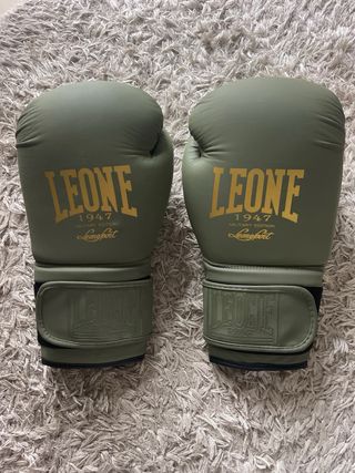 Par de guantes de boxeo Leone 1947. Están como nuevos, solo dos tres usos de entrenamiento con saco ya que me apunté junto a mi pareja y lo tuvimos que dejar al poco por lesión. Viene con vendas para entrenamientos - Color verde militar. - Diseño Military Edition. - Logo Leone 1947 en dorado.