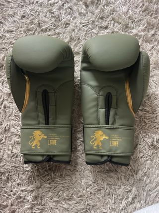Guantes de boxeo Leone Military Edition en color verde y detalles dorados. - Diseño militar. - Cierre de velcro. - Logo de Leone 1947. - 16 onzas - Sin usar (fue un regalo).