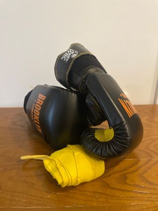 Par de guantes de boxeo Brooklyn Fitboxing en color negro con detalles en amarillo. Incluyen vendas. - Guantes de boxeo. - Marca: Brooklyn Fitboxing. - Color: Negro y amarillo. - Talla M en uno de los guantes. - Incluye vendas de boxeo amarillas.