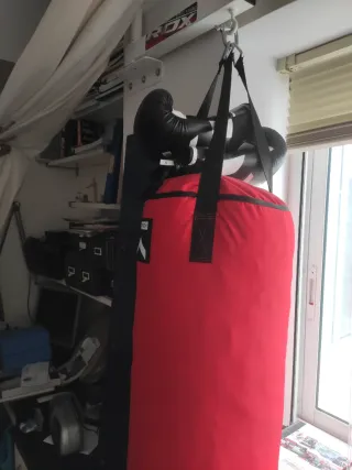 Se vende saco de boxeo RDX de color rojo, con soporte giratorio y guantes. - Saco de boxeo RDX. - Soporte giratorio. - Guantes de boxeo.
