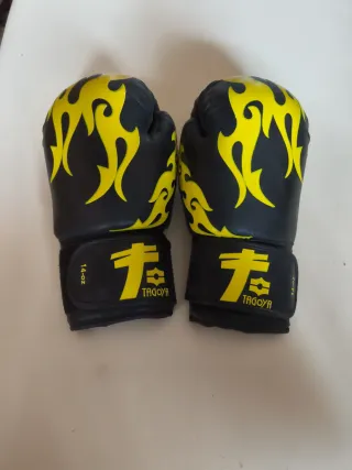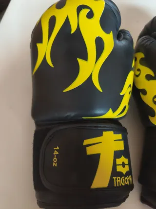 Par de guantes de boxeo de la marca Tagoya. - Color negro con diseño de llamas amarillas. - Cierre de velcro. - Peso: 14 onzas.