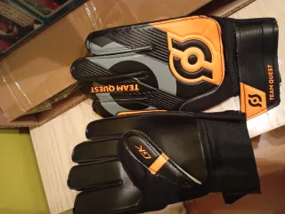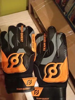 Guantes de portero de la marca Team Quest. - Diseño en color negro y naranja. - Logo de la marca en la parte superior. - Cierre de velcro en la muñeca.