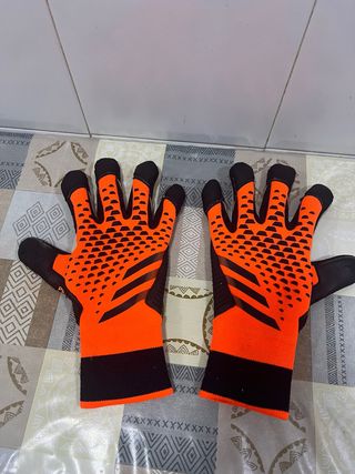 Guantes de portero Adidas Predator en color naranja y negro. Diseñados para un buen agarre. - Palma con puntos de silicona para mayor adherencia. - Muñeca elástica para un ajuste cómodo. - Diseño deportivo y llamativo. - Precio nuevos 215€