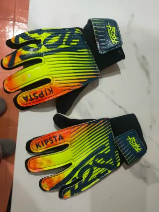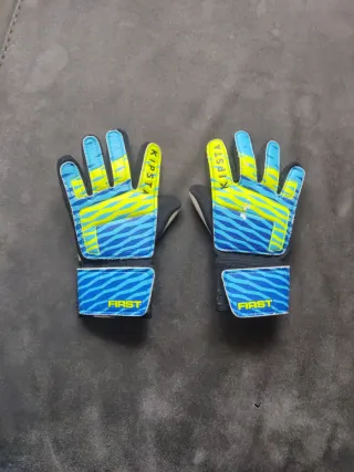 Par de guantes de portero Kipsta con diseño llamativo. - Talla 5-6 años - Diseño con franjas azules y amarillas. - Inscripción KIPSTA en los dedos. - Inscripción FIRST en la muñeca.