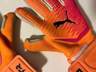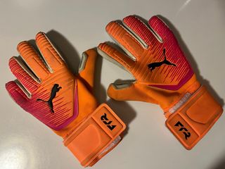 Guantes de portero de la marca Puma en llamativos tonos naranja y rosa. - Diseño con detalles en rosa degradado. - Logo de Puma en negro. - Cierre de velcro en la muñeca. - Detalle FFR en la correa.