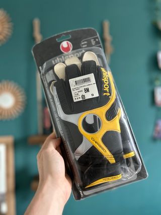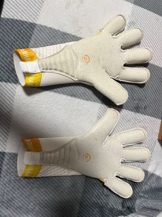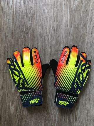 Guantes de portero de marca, usados solo dos veces. - Diseño llamativo en amarillo y negro. - Detalles en naranja. - Cierre de velcro.