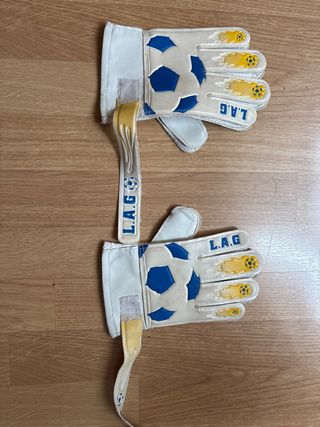 Guantes de portero de fútbol con diseño de balón. - Color blanco con detalles en azul y amarillo. - Cierre de velcro en la muñeca. - Inscripción L.A.G. en la parte superior. -Guantes de niño