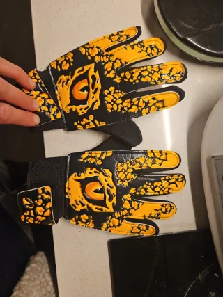 Conjunto de guantes de portero de la marca Numes. - Disponibles en varios colores vibrantes: naranja, amarillo, burdeos y azul. - Diseño con logo de la marca en la muñeca y en el dorso. - Cierre de velcro ajustable. -Talla disponibles 5 y 6