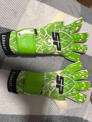 Guantes de portero de la marca SP, modelo Earhart Pro. - Diseño con detalles en rojo y verde. - Cierre de velcro en la muñeca. - Logo de la marca SP en el dorso. -Talla 7.5