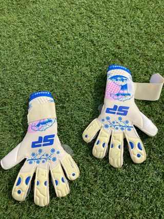 Guantes de portero SP con un diseño llamativo en color verde y blanco. - Diseño con motivos florales y hojas. - Cierre de velcro en la muñeca. - Logo SP en la palma. - Detalle FitControl en los dedos. -Talla 7.5