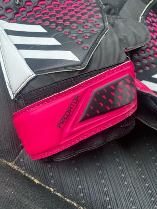 Guantes de portero Adidas Predator. - Talla 9. - Diseño en negro, rosa y blanco. - Cierre de velcro en la muñeca.