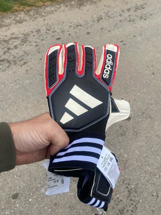 Guantes de portero Adidas Tiro en talla 9. Diseñados para ofrecer un buen agarre y protección. - Color principal negro con detalles en rojo y blanco. - Logo de Adidas en el dorso. - Cierre de velcro en la muñeca.