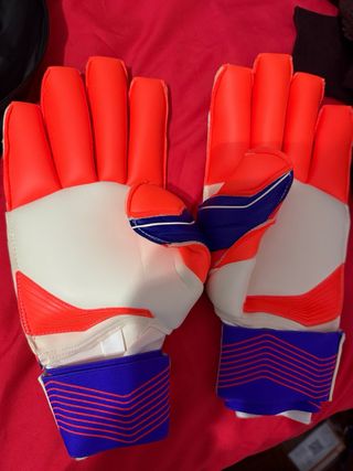 Guantes de portero Adidas Predator en color naranja y azul. - Diseño con detalles en blanco. - Cierre de velcro en la muñeca. - Logo de Adidas en el dorso.