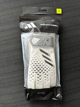 Guantes de portero Adidas Predator Training J para niño. - Diseño en color blanco y gris. - Talla 4. - Cierre de velcro en la muñeca. - Logo de Adidas y Predator. - Corte Positive Cut.
