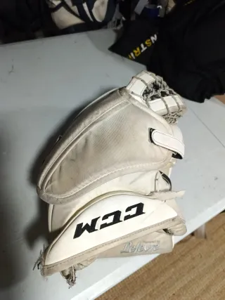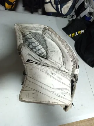 Guante de portero de hockey CCM, diseñado para ofrecer protección y control. - Color blanco con detalles en gris. - Cierre ajustable. - Malla interior para mayor comodidad.